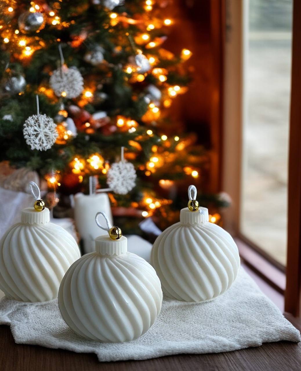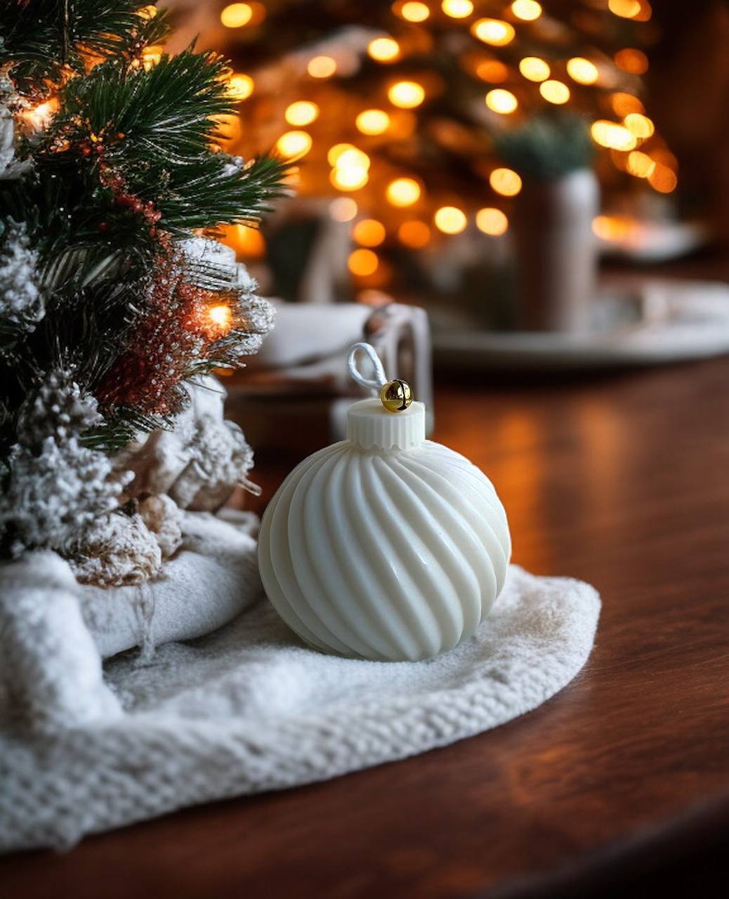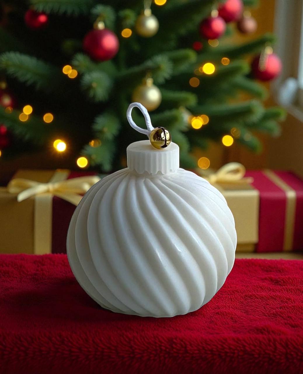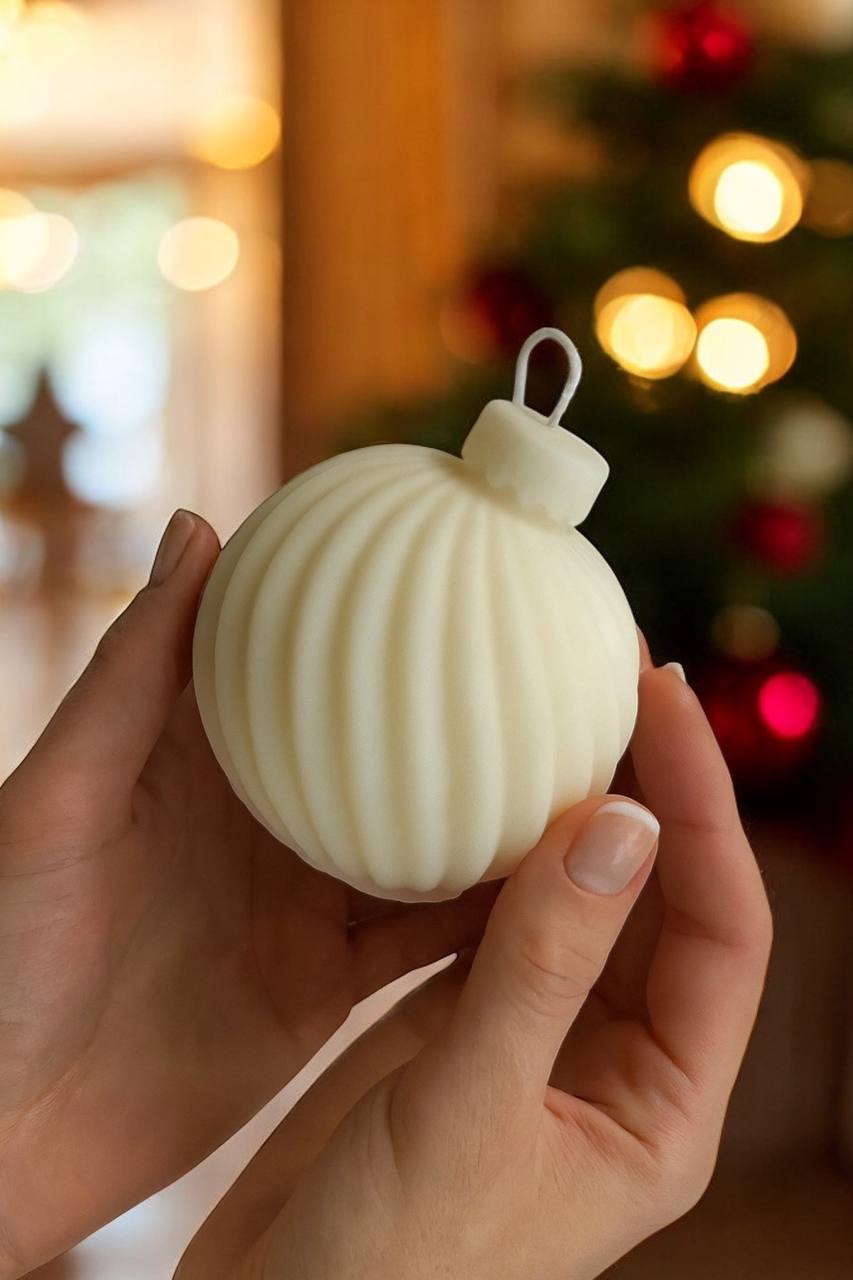 Форма новорічної кулі виглядає витончено та елегантно. Ніжний білий відтінок, плавні спіральні лінії та делікатний золотий акцент роблять її схожою на справжню ялинкову прикрасу. Вона гармонійно виглядає під ялинкою, на каміні або як частина святкової композиції.
