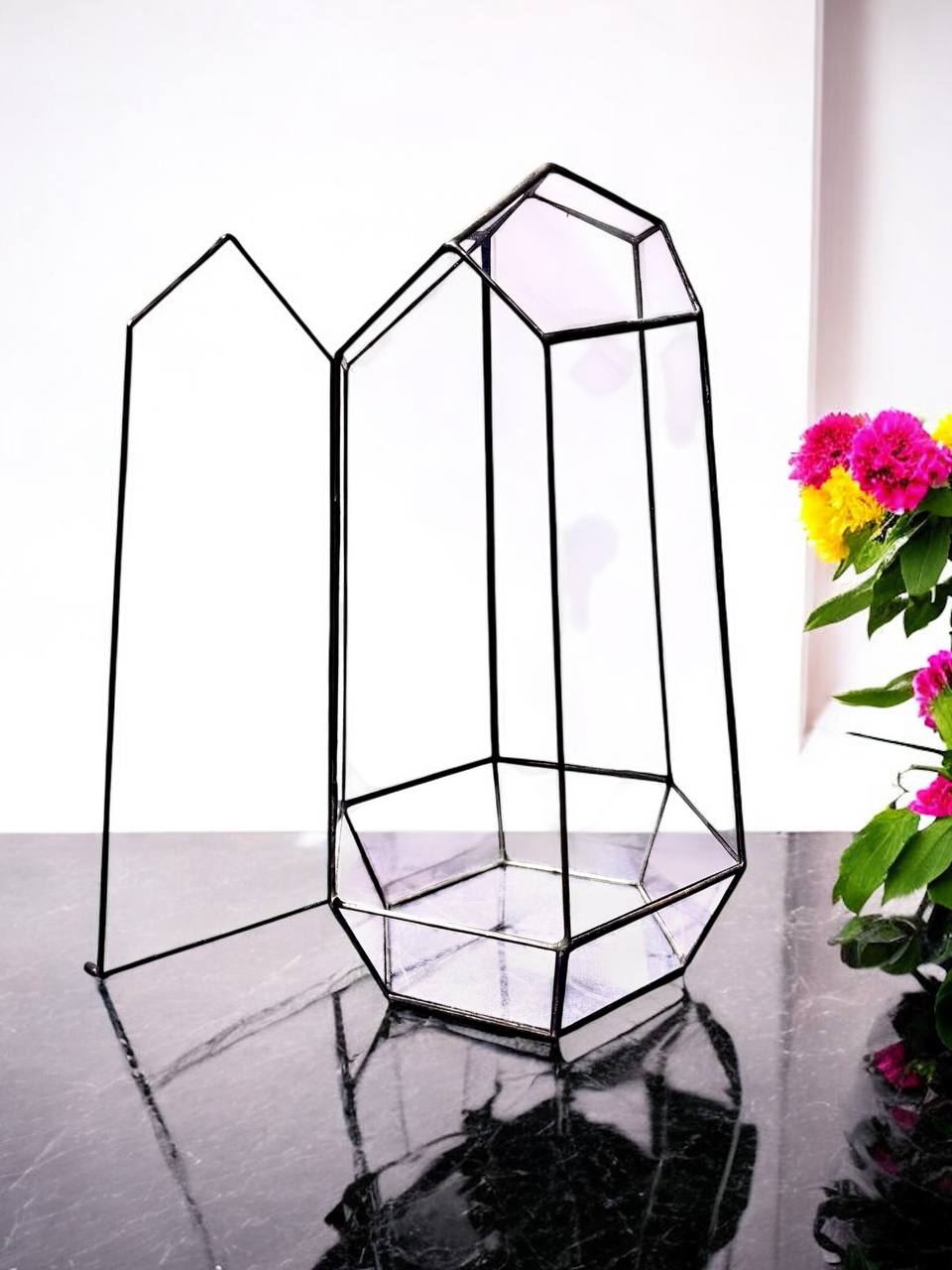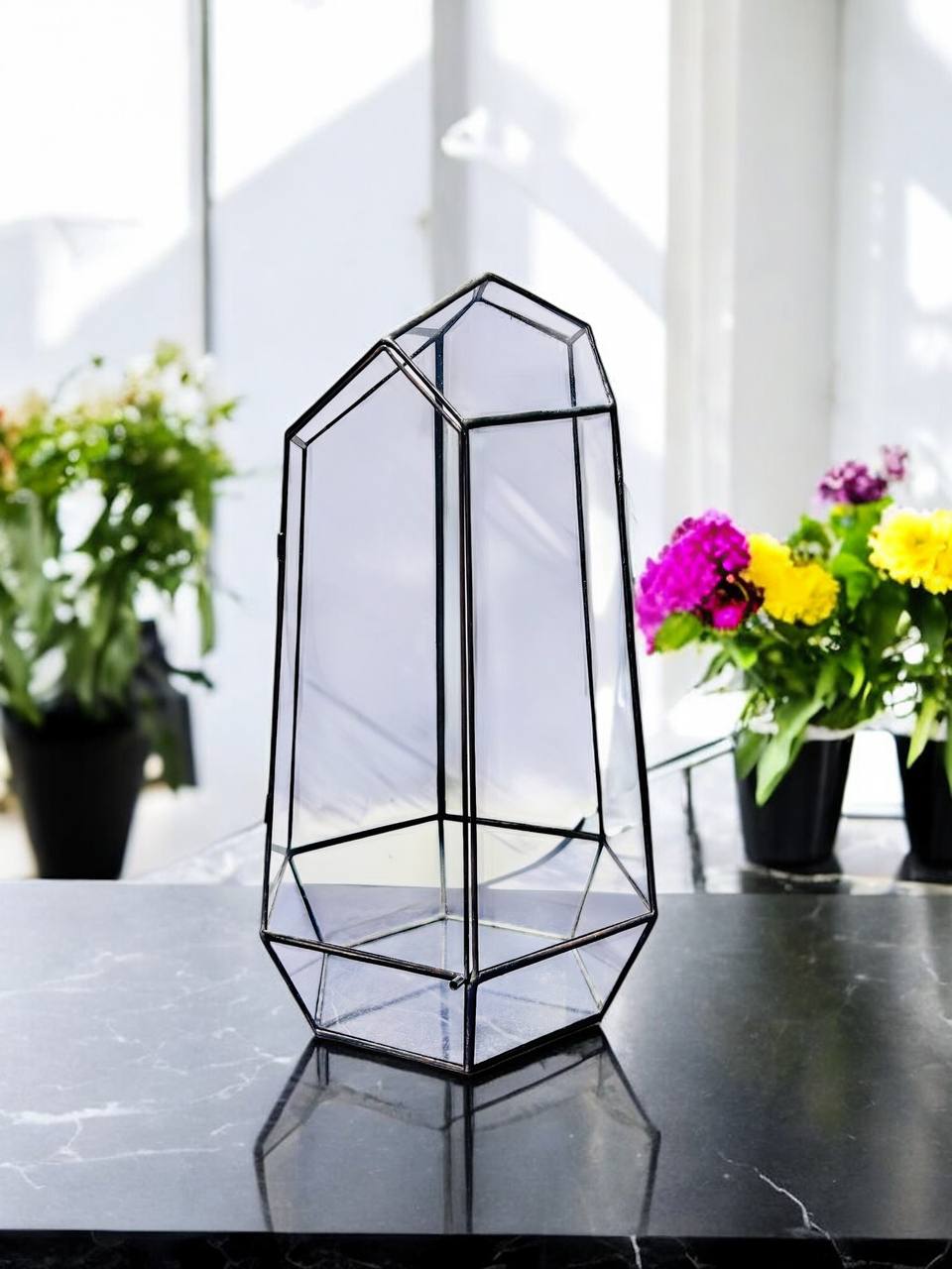 Флораріум виготовлений вручну за технікою Tiffany з преміального італійського скла. Усі елементи з’єднані пайкою металом без використання клею, що забезпечує надійність конструкції та довговічність виробу. Після пайки шви проходять обробку спеціальним захисним засобом від окислення, завдяки чому флораріум зберігає охайний вигляд і благородний блиск з часом. Відкривна конструкція забезпечує зручний доступ до внутрішнього простору, тож флораріум практичний для створення та оновлення композицій.