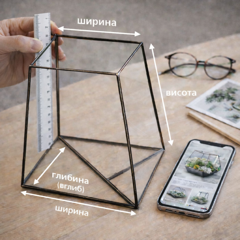 Індивідуальний флораріум — це не готовий шаблон, а спільна робота над формою, пропорціями та настроєм. Саме тому попереднє розуміння розмірів і стилю є ключовим етапом створення виробу, який буде виглядати цілісно й естетично у реальному просторі.
