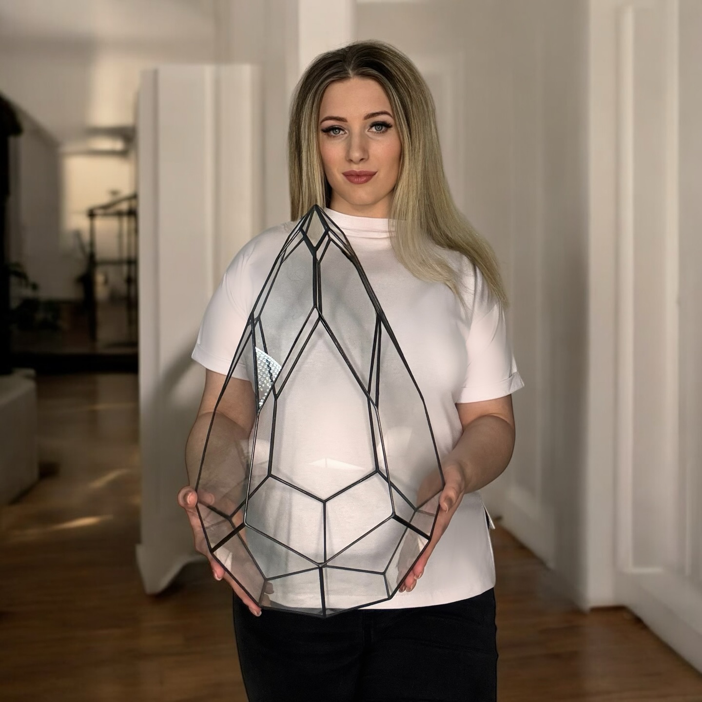 Флораріум «Венера» вирізняється витягнутою, плавною формою та складною геометрією, яка виглядає як скульптурний об’єкт у просторі. Завдяки висоті та пропорціям він одразу привертає увагу й формує виразний інтер’єрний акцент, не потребуючи додаткового декору.