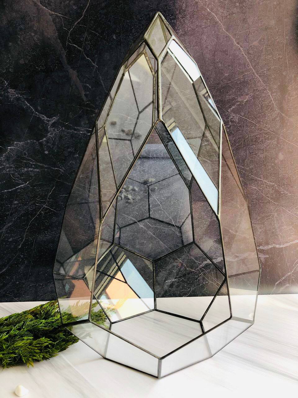 Флораріум виготовляється вручну з преміального італійського скла у техніці «Тіффані». Усі елементи з’єднані пайкою металом без використання клею, що забезпечує надійність конструкції та довговічність виробу. Після пайки шви проходять обробку спеціальним захисним засобом від окислення, завдяки чому флораріум зберігає охайний вигляд і благородний блиск з часом.