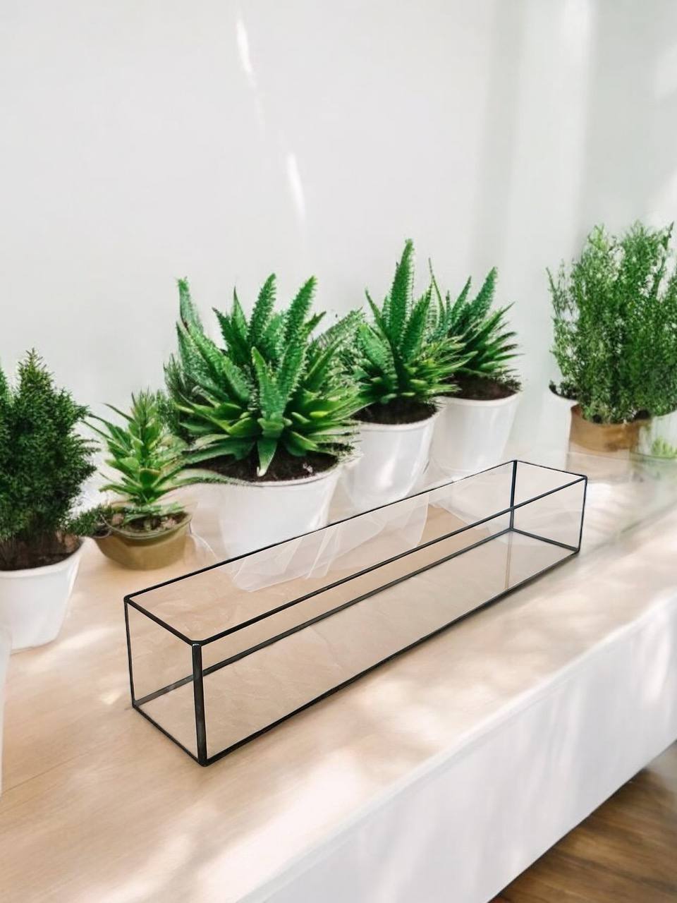 Завдяки подовженому формату мосаріум гармонійно виглядає на довгих поверхнях: підвіконнях, консолях, відкритих полицях. Він може виступати як самостійний акцент або як основа для стриманих декоративних композицій і просторових рішень.