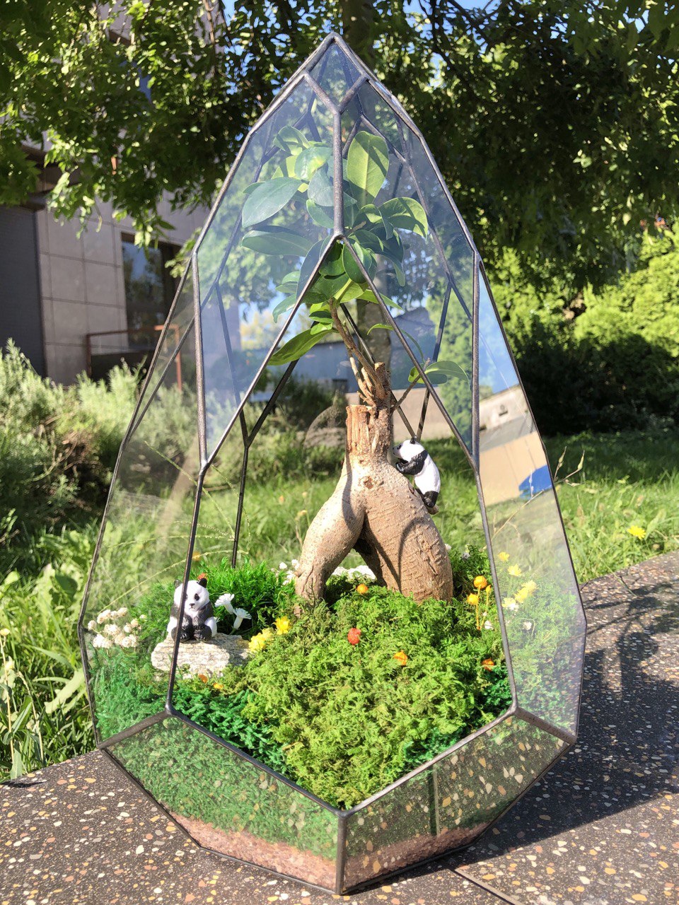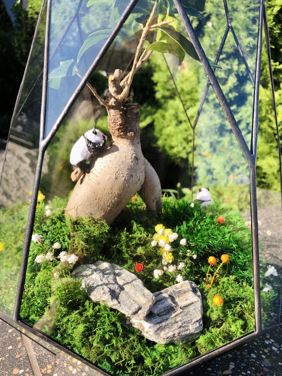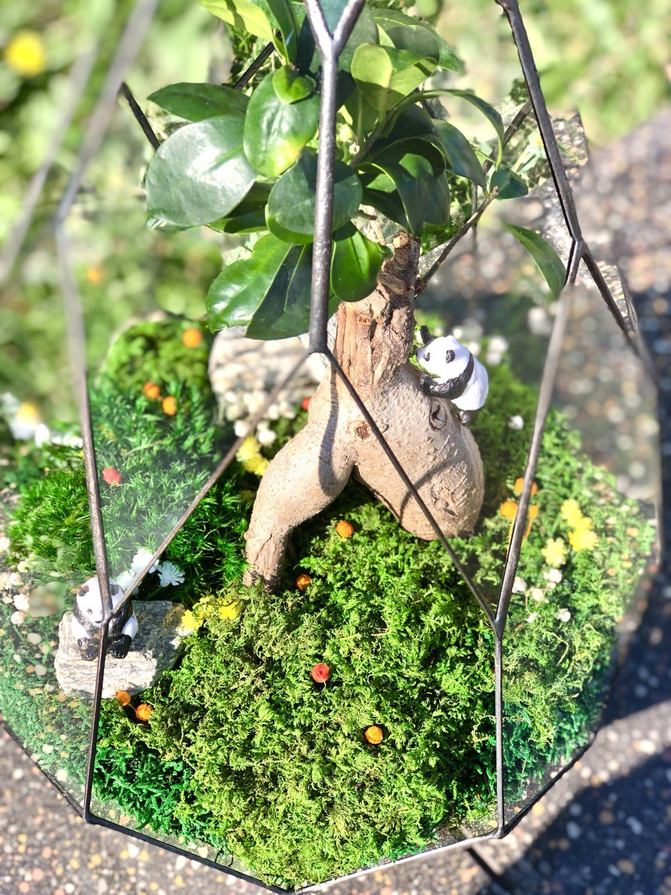 Мосаріум «Panda Land» з деревом Бонсай та стабілізованим мохом — це жива декоративна композиція з характером, у якій поєднуються природна сила, символізм і сучасний дизайн. Образ Бонсай у поєднанні з деталями композиції створює атмосферу спокою, затишку та внутрішньої гармонії, перетворюючи флораріум на емоційний акцент інтер’єру.