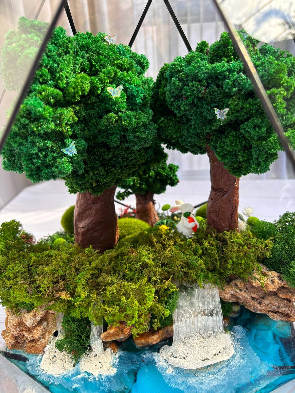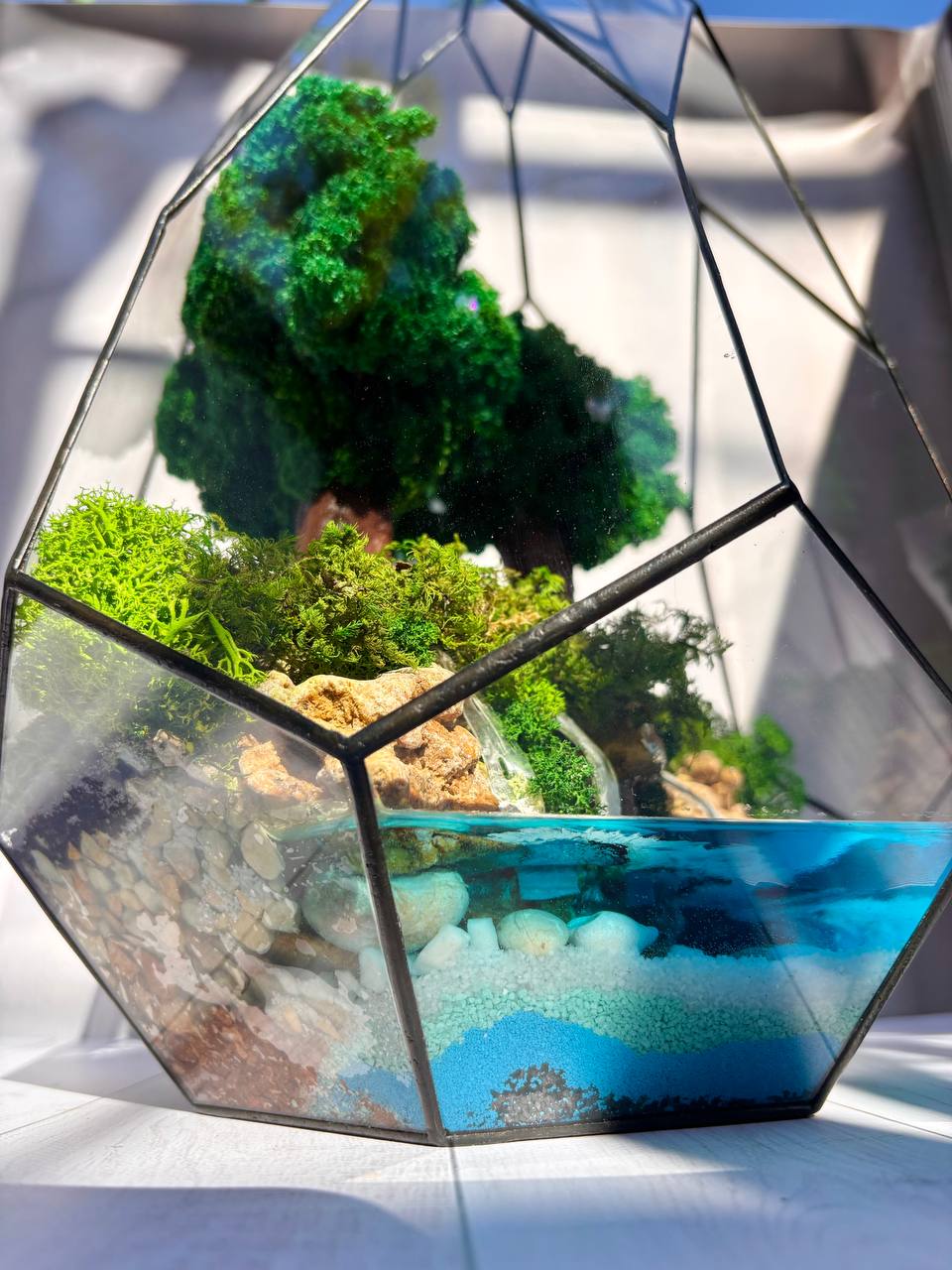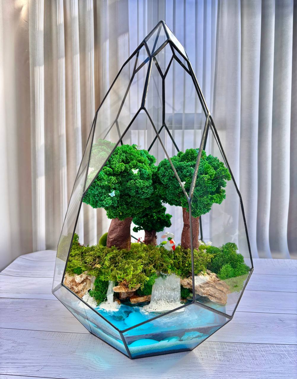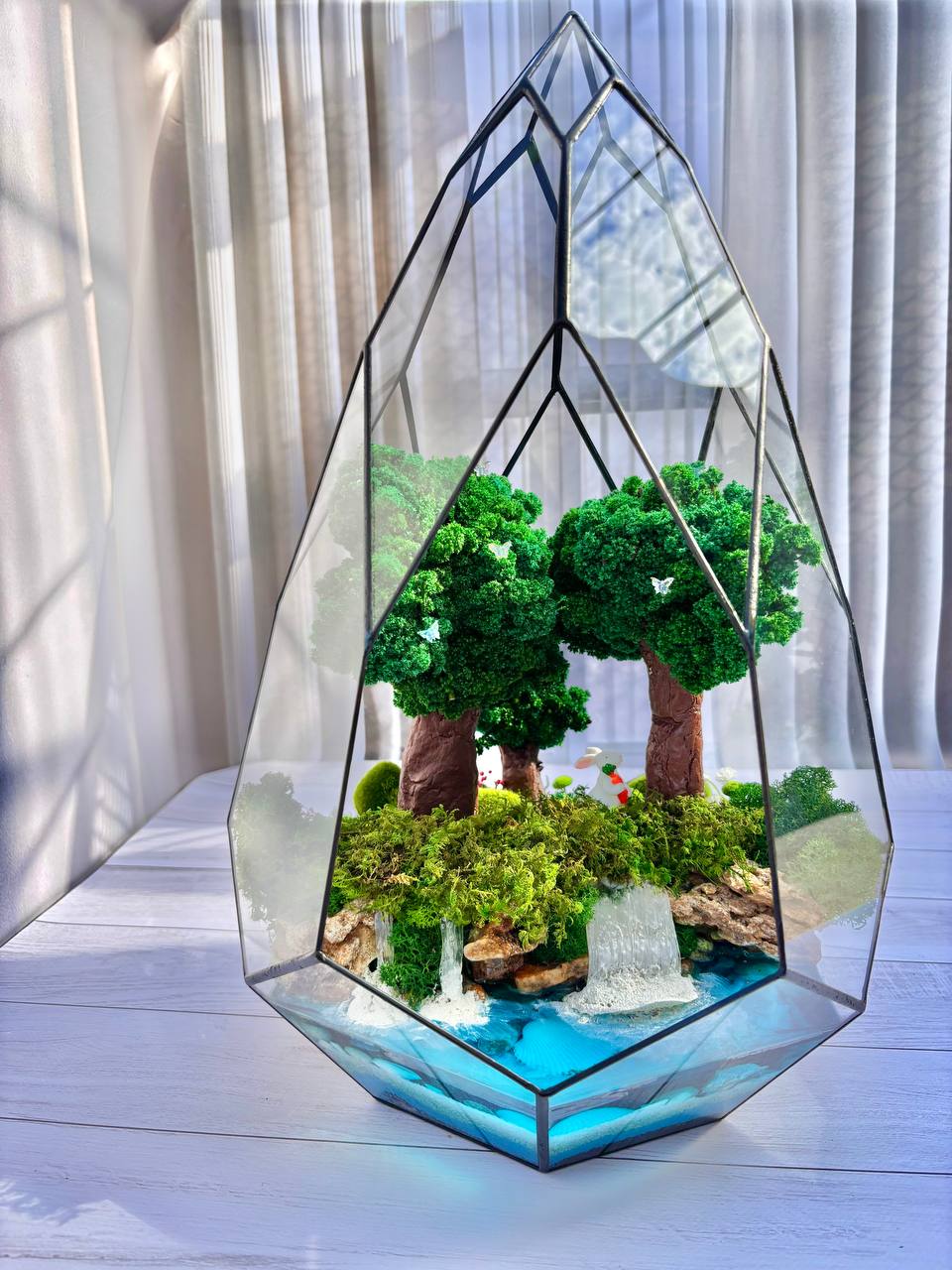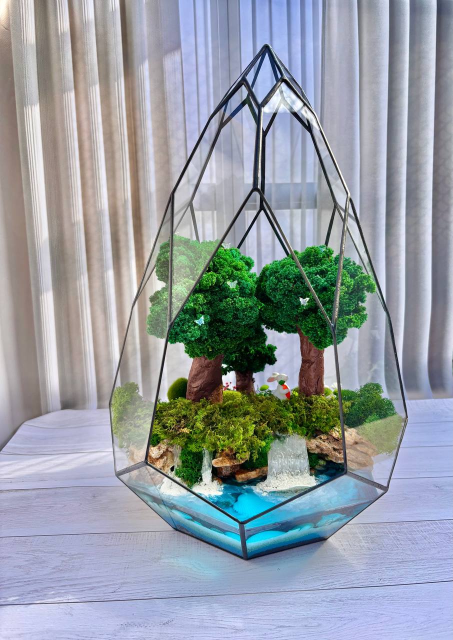 Флораріум виготовлений у техніці «Тіффані» з преміального італійського скла. Кожен шов виконаний із ювелірною точністю, а грані відшліфовані до досконалості. Усередині — авторська композиція з натуральних матеріалів: декоративне дерево з кроною зі стабілізованого моху, який зберігає свіжість і природний колір протягом багатьох років.