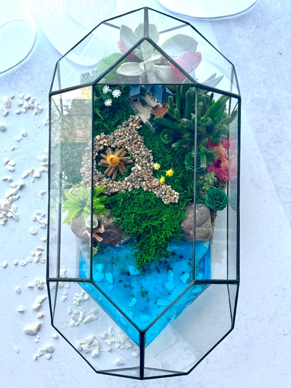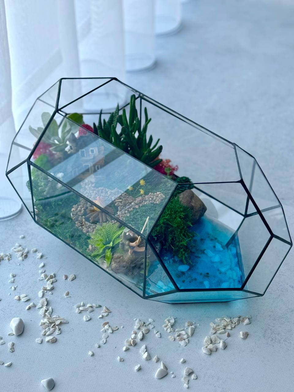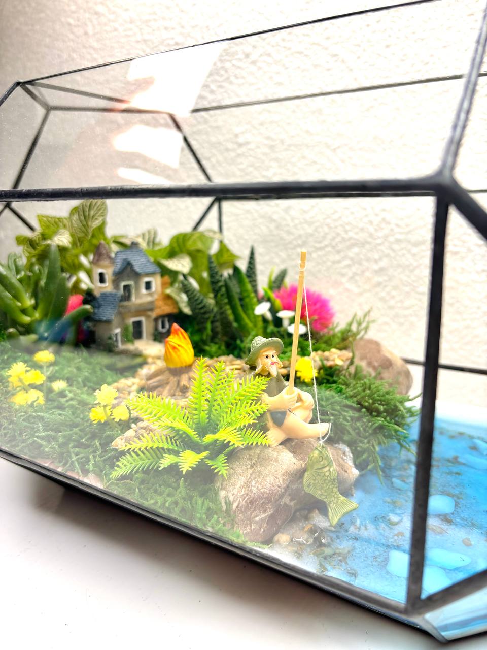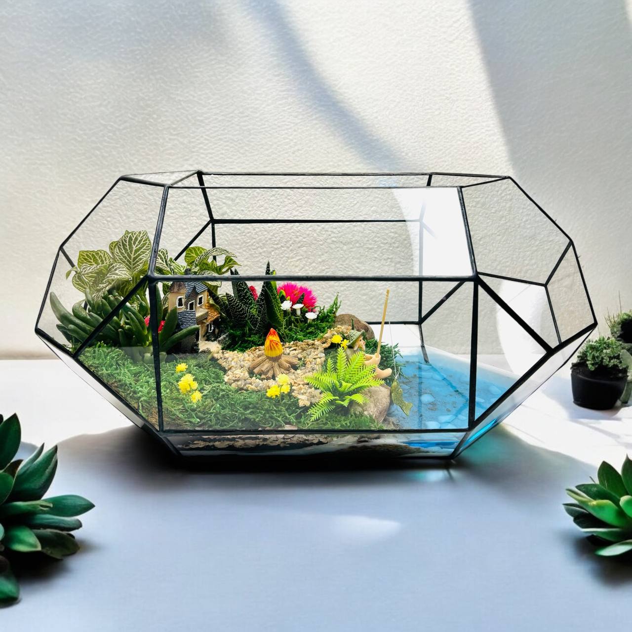 Мосаріум Fisherman’s Corner — це витончена дизайнерська композиція з живими сукулентами, що передає атмосферу спокою, природи та гармонії. Деталізований ландшафт із декоративним будиночком, водоймою та кам’яною доріжкою створює ефект маленького світу, який притягує погляд і дарує відчуття затишку.