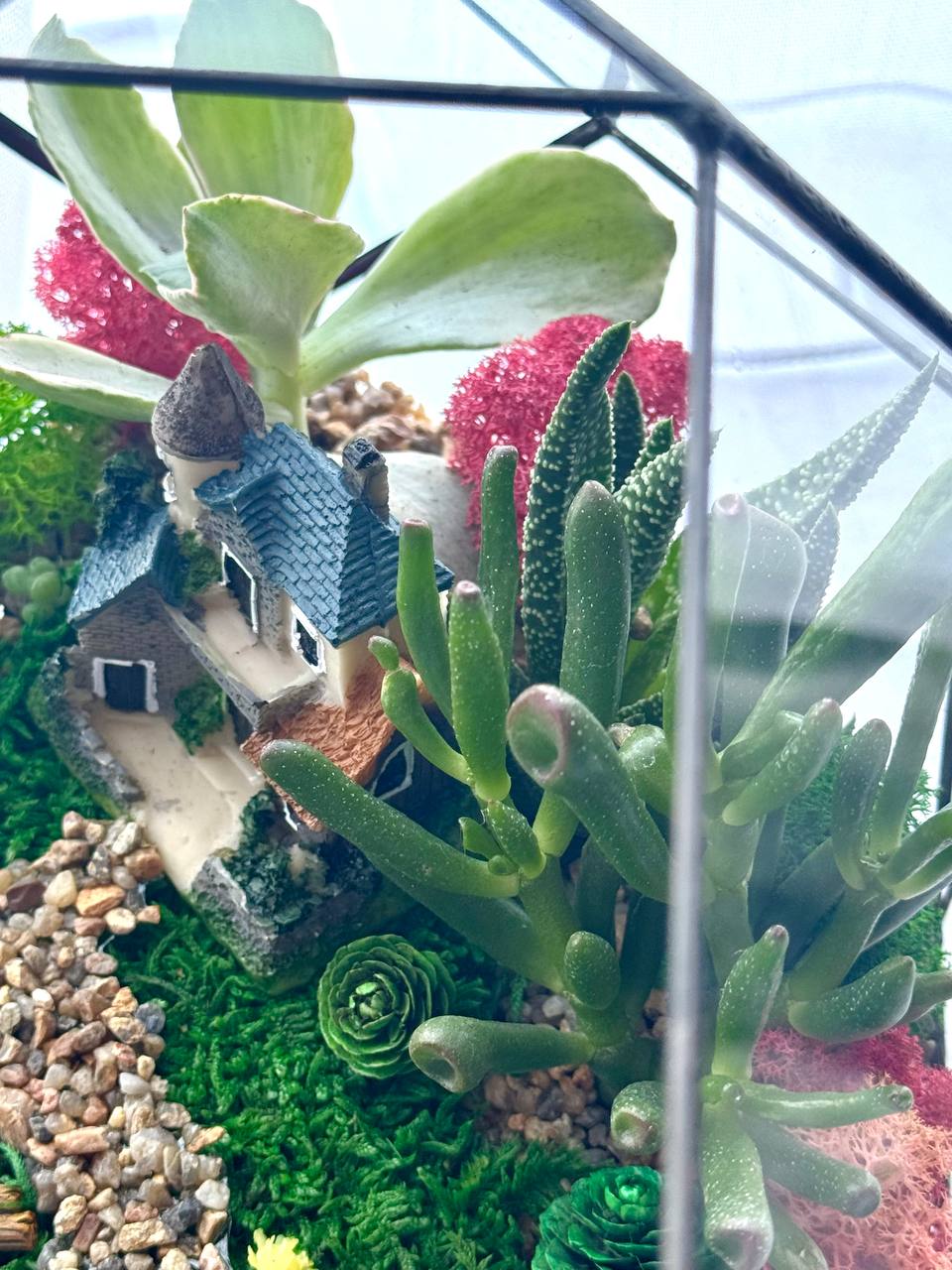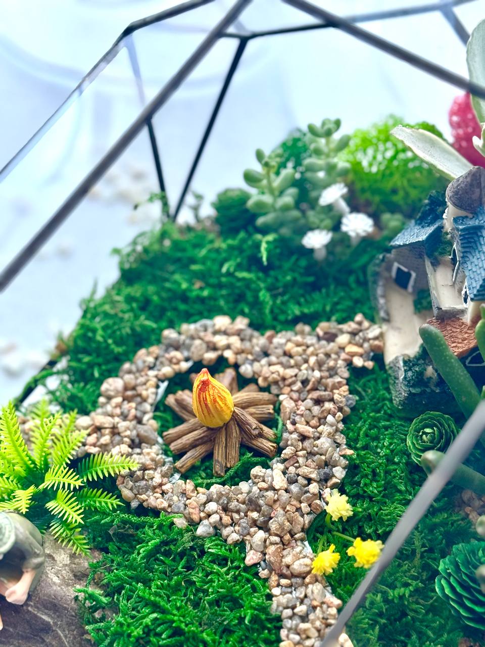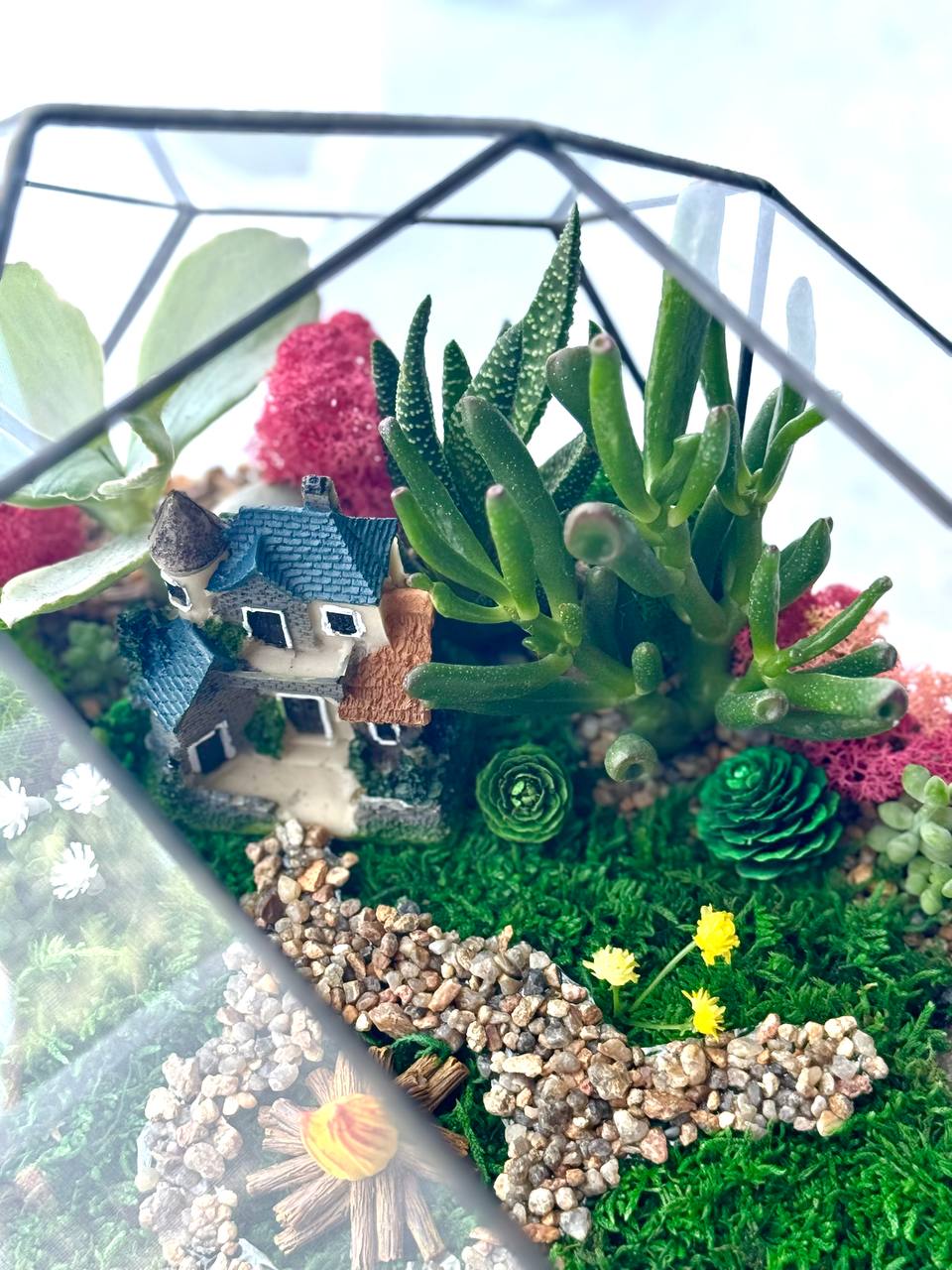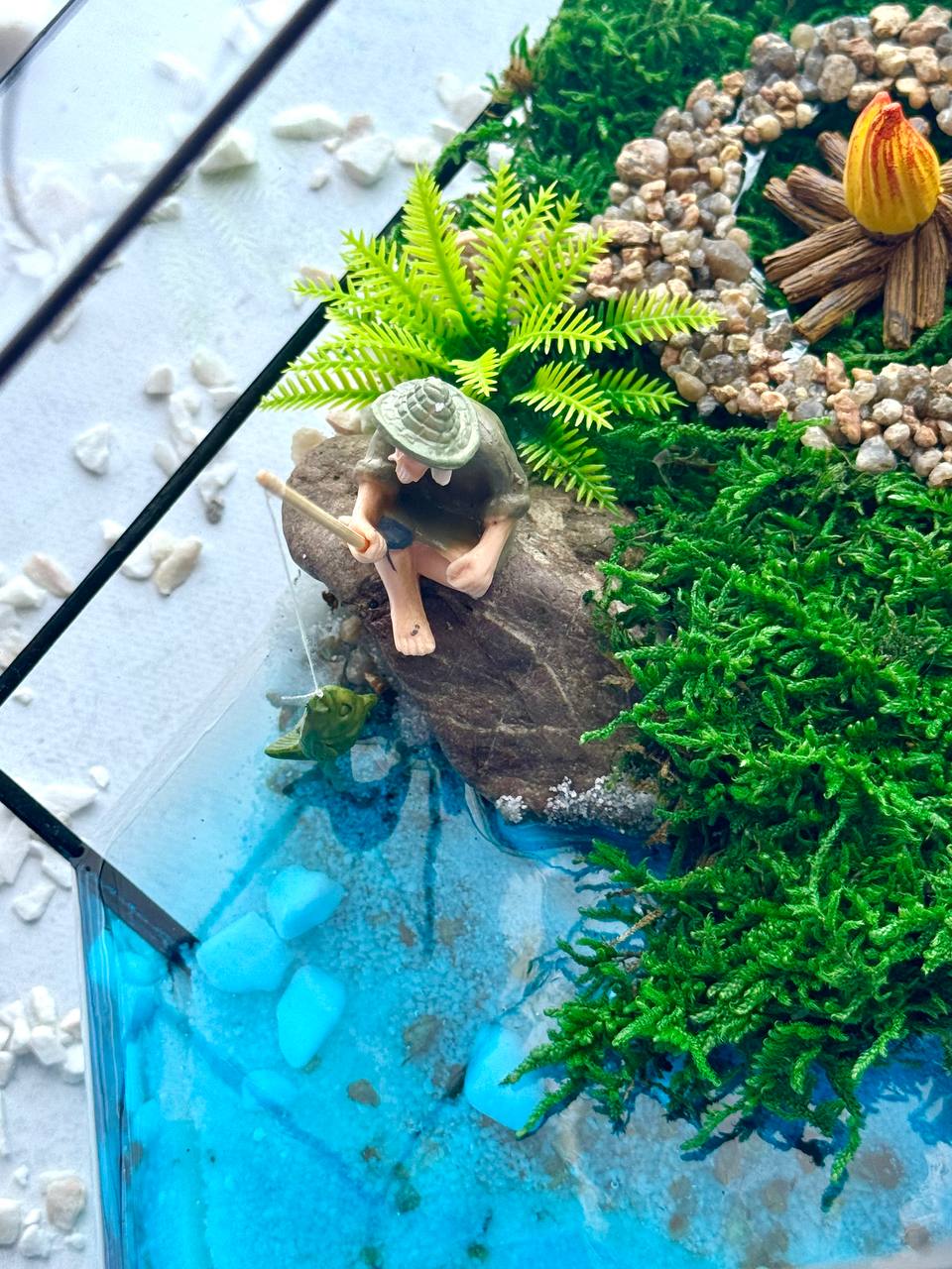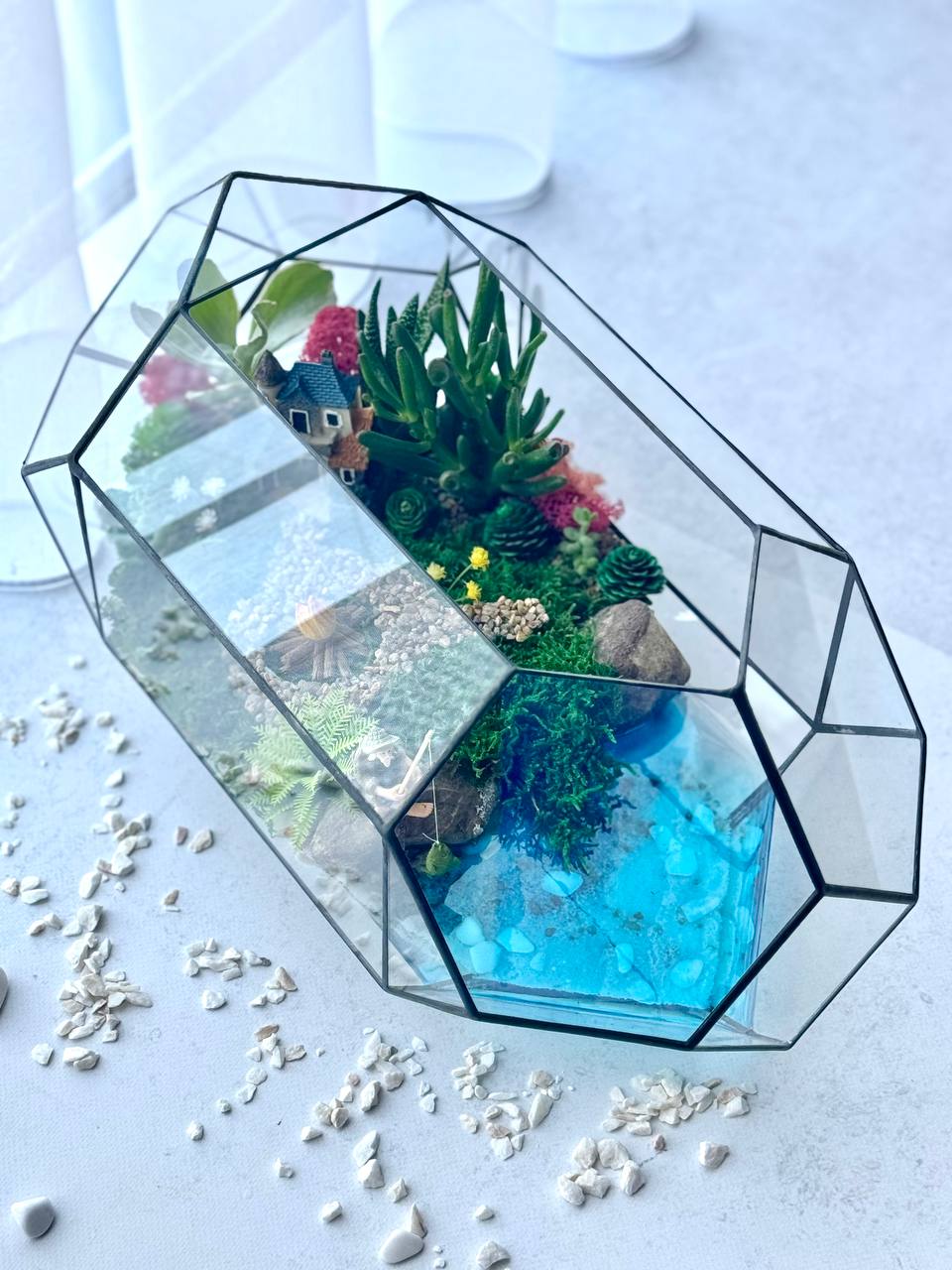 Мосаріум Fisherman’s Corner — це витончена дизайнерська композиція з живими сукулентами, що передає атмосферу спокою, природи та гармонії. Деталізований ландшафт із декоративним будиночком, водоймою та кам’яною доріжкою створює ефект маленького світу, який притягує погляд і дарує відчуття затишку.