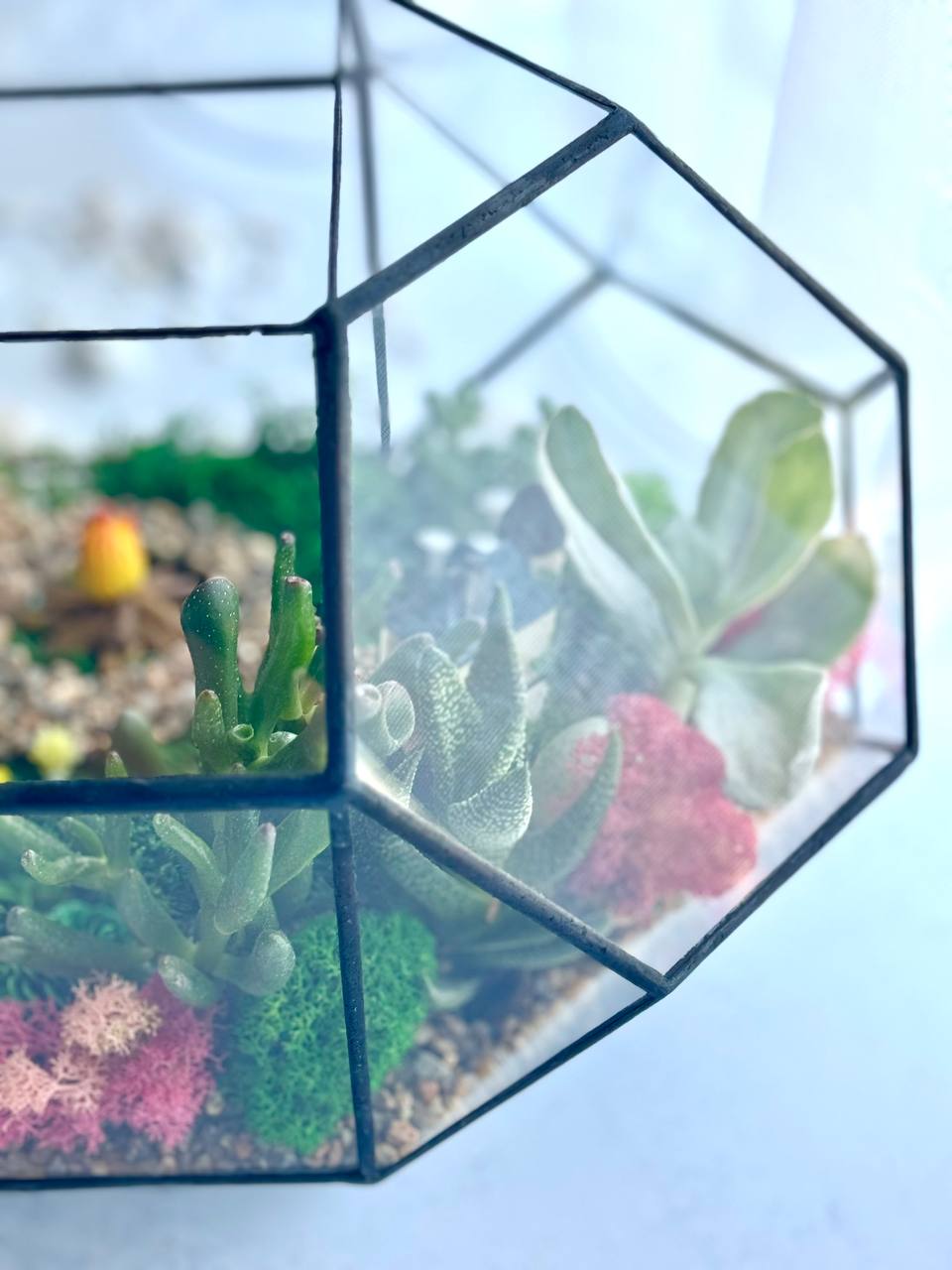 Оскільки у мосаріумі використовуються живі рослини, кожен сукулент має власну природну індивідуальність. Форма, розмір і відтінок рослин можуть незначно відрізнятися від фото, що підкреслює унікальність кожної композиції.