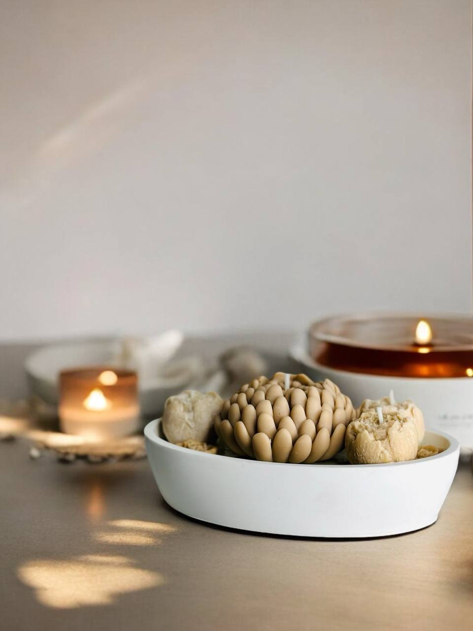 Свічна композиція виготовлена з натурального соєвого та кокосового воску — екологічно чистого, безпечного та такого, що горить рівно й без кіптяви. Віск не містить парафіну, тому підходить навіть для чутливих приміщень і щоденного використання. Свічка розміщена у стильному гіпсовому кашпо, яке гармонійно вписується в інтер’єр і виглядає як самостійний декоративний об’єкт.
